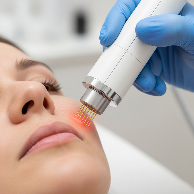 It combines microneedling with radiofrequency energy to stimulate collagen and tighten deeper layers of the skin.